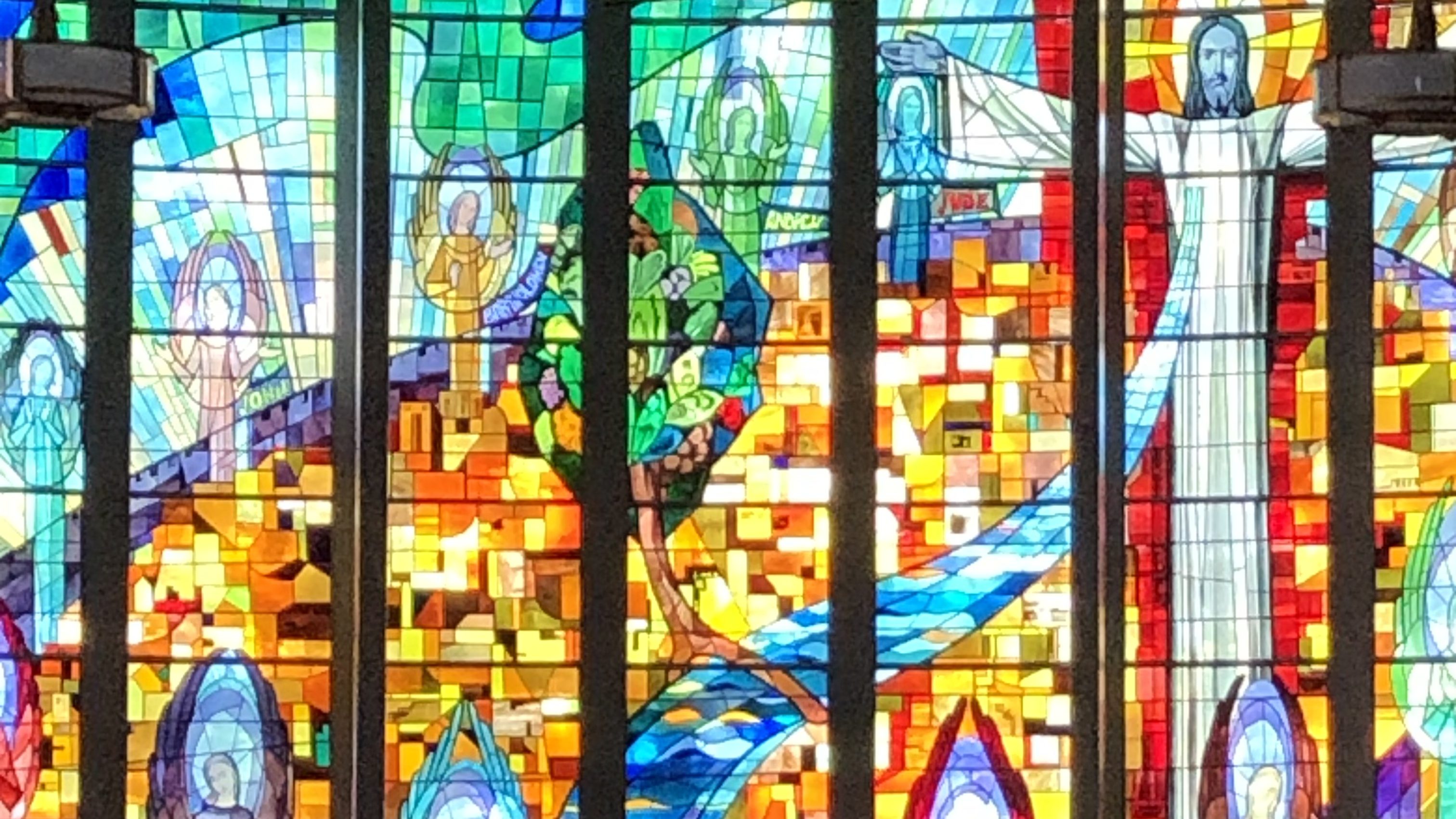 While staying at the Notre Dame Spirituality Center in Ipswich, Massachusetts, I was struck by the beautiful stained glass in Our Lady Queen Chapel designed by Vincent De Paul Curran, SNDdeN (pictured here; trust me that my photo does not do it justice!). The glass depicts the scene from Revelation 22 with a glorious tree and river of life. In a time of ecological crises, this vision of our future with God is particularly poignant.
